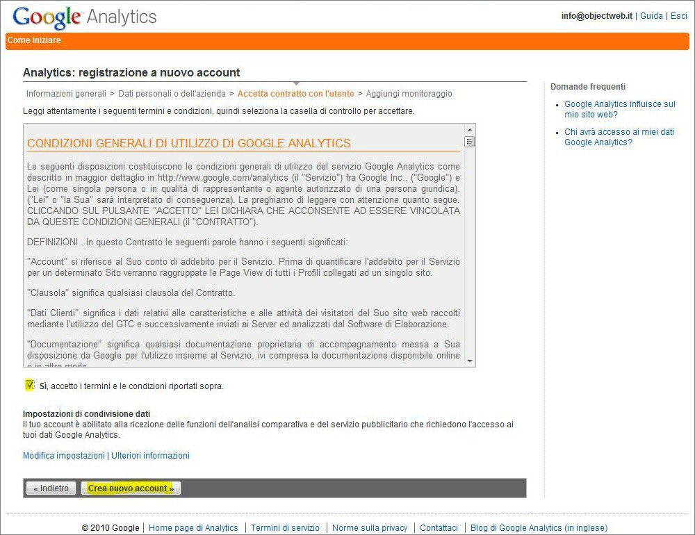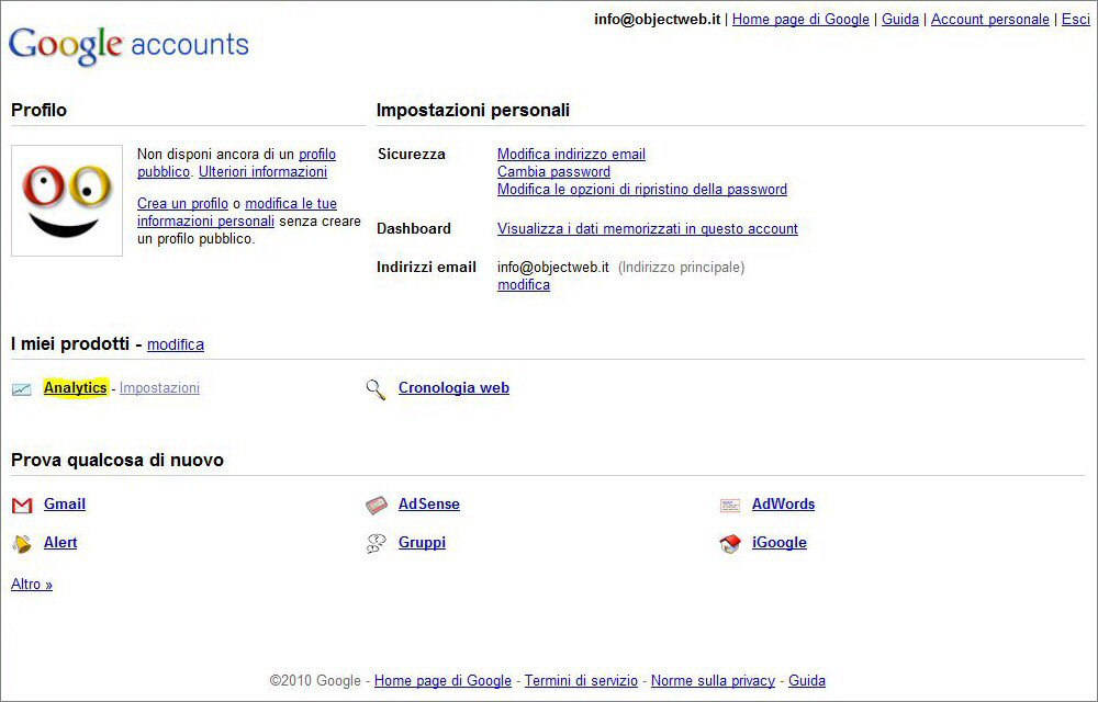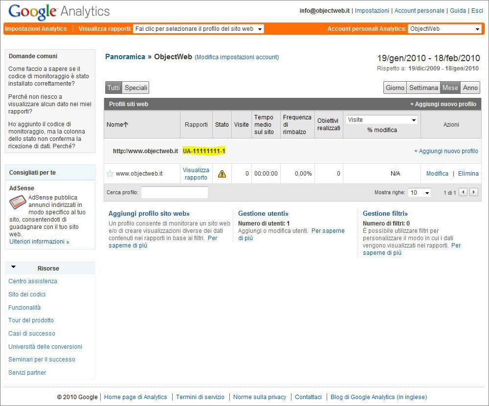 In questo articolo ti spieghiamo come creare un sistema di statistiche sul tuo sito per poter effettuare analisi sui visitatori, sulle sorgenti di traffico, sulle parole chiave utilizzate e tanto altro ancora. La soluzione proposta permette di integrare in modo semplice nel tuo sito su ObjectWeb il potente motore di statistiche di Google Analytics. I passi da effettuare sono: